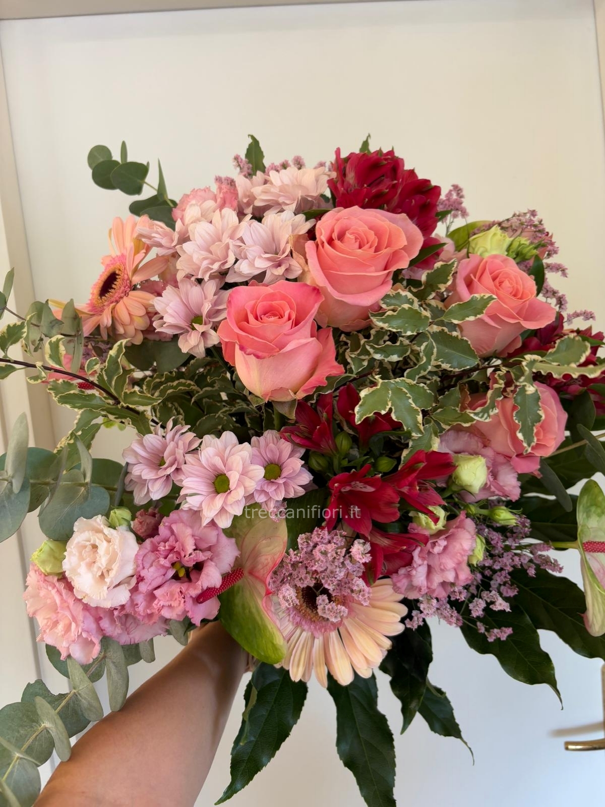 Bouquet con rose, alstromeria, gerbere, mazzetteria, anthurium, lisianthus e statice