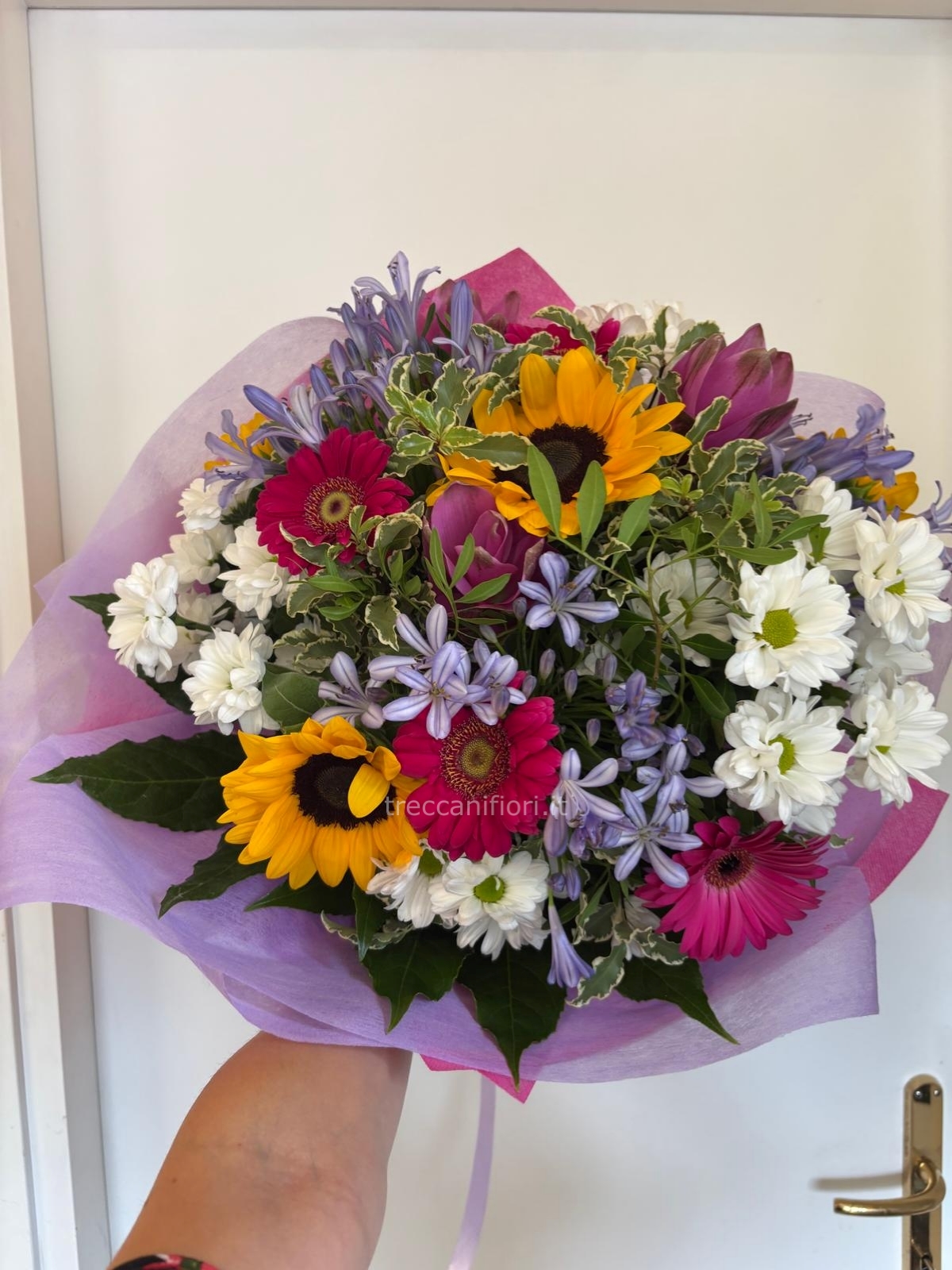 Bouquet misto: girasoli, gerbere, agapanthus, curcuma e mazzetteria